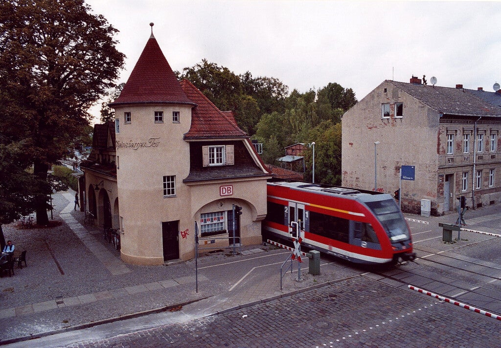 Bahnhofsteil Rheinsberger Tor in Neuruppin mit einem Zug des Regional-Expresses RE 6 in Richtung
